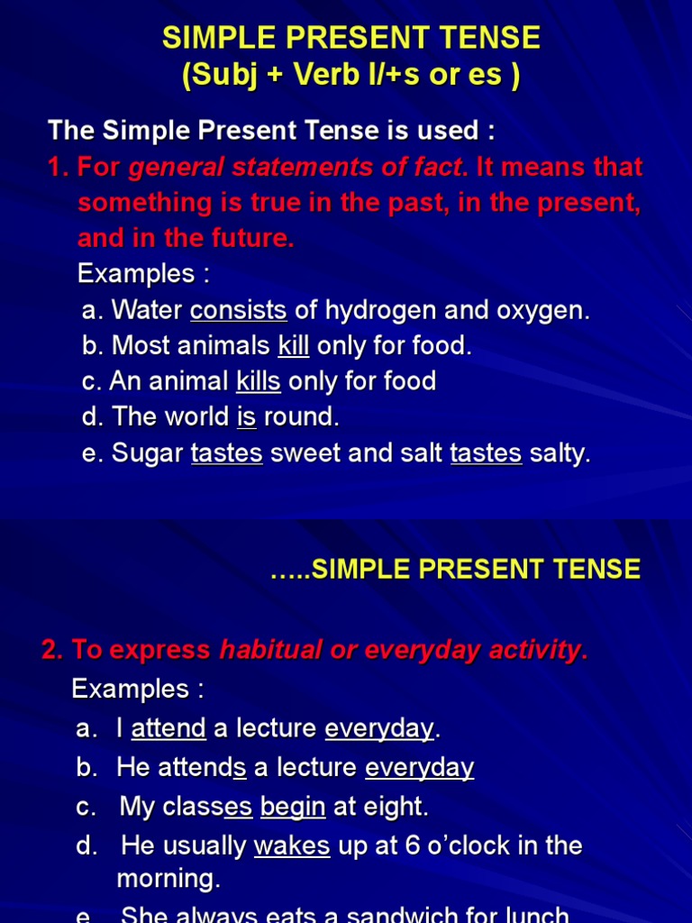 The simple present tense is used to describe facts and habits, to tell stories, and to describe scheduled events in the future (e.g., the train arrives at 5 o'clock.) the simple present tense is quite easy to form, but it quite difficult to use. It is used to describe habits, unchanging situations, general truths, and the simple present tense is simple to form. (i take, you take, we take, they take) the 3rd person singular takes an. The simple present (also called present simple or present indefinite) is a verb tense which is used to show repetition, habit or generalization. The present simple tense (also called the simple present tense) is used when we speak about habits, general facts, and timetables. If the subject is a singular noun i.e. In this video, i will explain you what is simple present tense.watch more videos on. (there's more on this below.) It is used to talk about repeated actions and read about the rules for using the simple present tense, how we form it, and tons of example sentences! Present simple and present time. The simple present, present simple or present indefinite is one of the verb forms associated with the present tense in modern english. Negative sentences in the simple present tense. Most verbs in the present simple tense are in the same form as the infinitive verb.